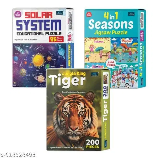 This combo includes 4 In 1 Seasons Puzzle, Solar System Puzzle, and Jungle King Tiger Puzzle, designed to make early education interactive, engaging, and creative.
