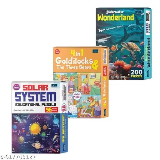 This combo includes 4 In 1 Goldilocks and The Three Bears Puzzle, Solar System Puzzle, and Underwater Wonderland Puzzle, designed to make early education interactive, colourful, and enjoyable for young learners.