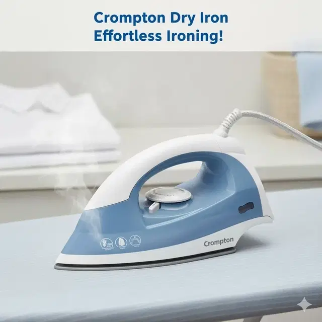Smooth and Safe Ironing Crompton Greaves CG-RD 750 watt dry iron smoothly irons all types of fabrics including cotton, silk, rayon, nylon and wool. It applies gentle pressure to remove the most rigid creases and make your clothes look as good as new. This Crompton Greaves dry iron has a thermostatic regulator knob to adjust the temperature for different types of fabrics. Simply turn the knob such that the indicator points to the fabric that you need to iron. This wired ironing master has a narrow and slim profile to reach the tricky areas of your clothes. Sky Blue Iron with Metal Soleplate The dry iron has a Sky Blue body with a matching anti heat handle that allows you to hold the iron with ease. Its metal soleplate heats up quickly for faster operations. The iron requires 750W power supply to do its job efficiently. There is a red indicator on the adjustable regulator for ironing convenience. The indicator glows when the iron is completely heated and ready to be used, and the light goes off when the iron requires to be powered. You can use the Crompton Greaves 750 Watt dry iron to give a crisper look to your clothes. Brand: Crompton Greaves Power: 750 watts Temperature adjustable regulator Metal soleplate Sky Blue body Anti heat handle Dry and smooth ironing Red Indicator Suitable for all kinds of fabric