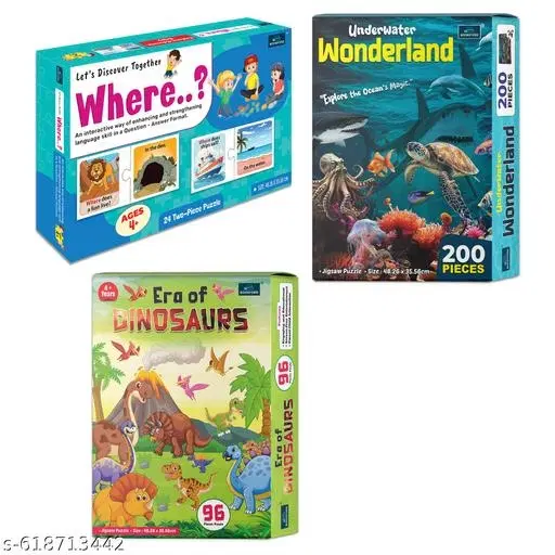 This combo includes Era of Dinosaur Puzzle, Let’s Discover Together Where Puzzle, and Underwater Wonderland Puzzle, designed to make education interactive, imaginative, and enjoyable for young minds.