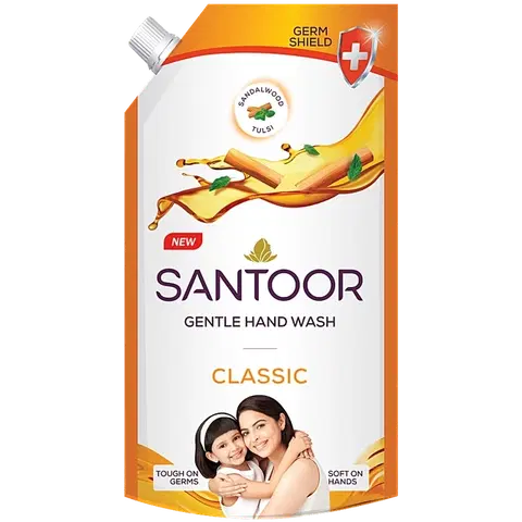 Santoor Classic Handwash enriched with the natural goodness of Sandalwood and Tulsi offers unique dual benefit of ?Tough on Germs and Soft on Hands?.